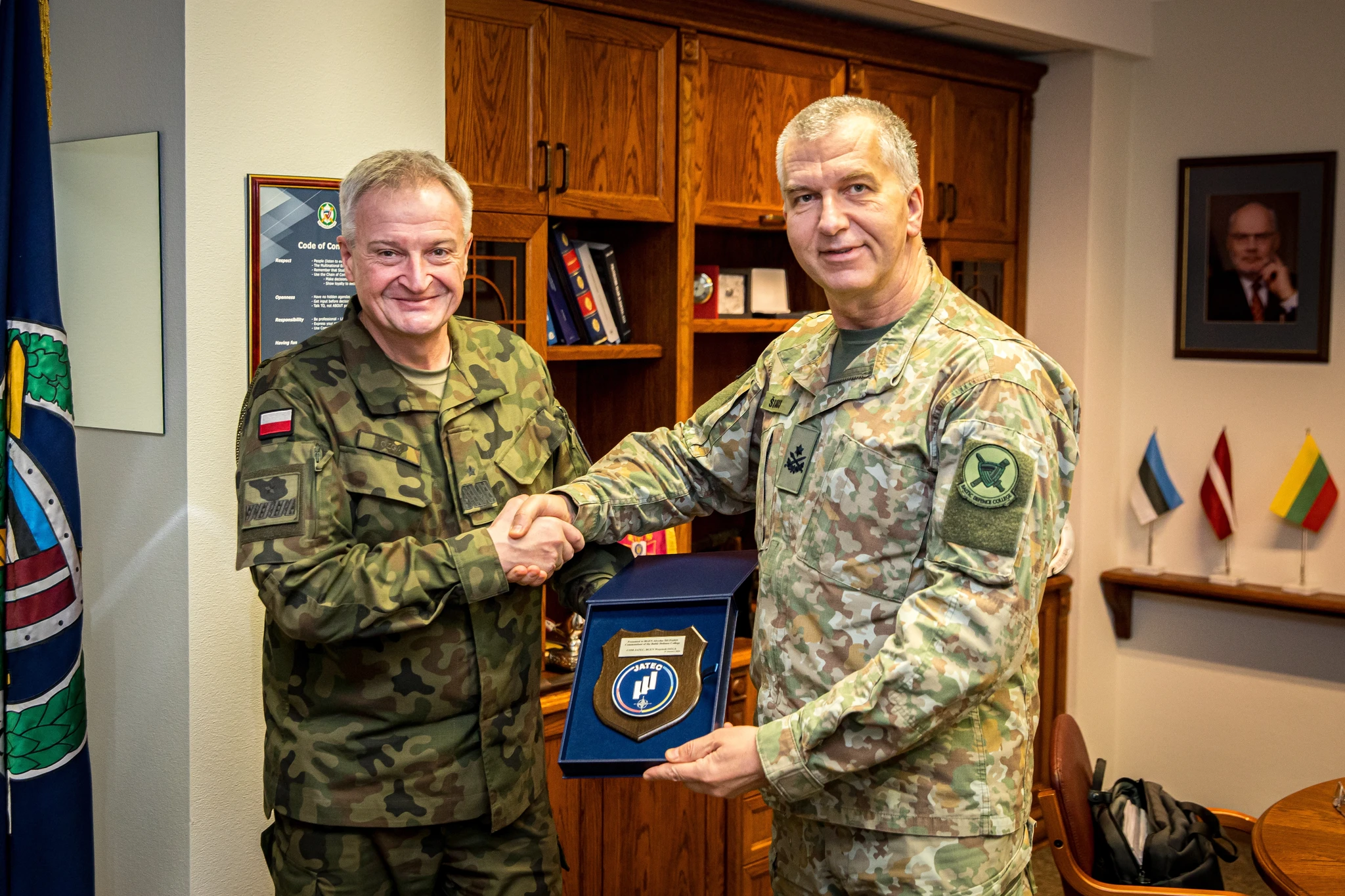 The Polish delegation was welcomed by the Commandant of BALTDEFCOL, Brigadier General Alvydas Šiuparis; the Polish Senior National Representative and Deputy Director of the Department of Military Studies, Captain (N) Rosław Jeżewski; and the Lecturer in International Relations, Mr Louis Wierenga.