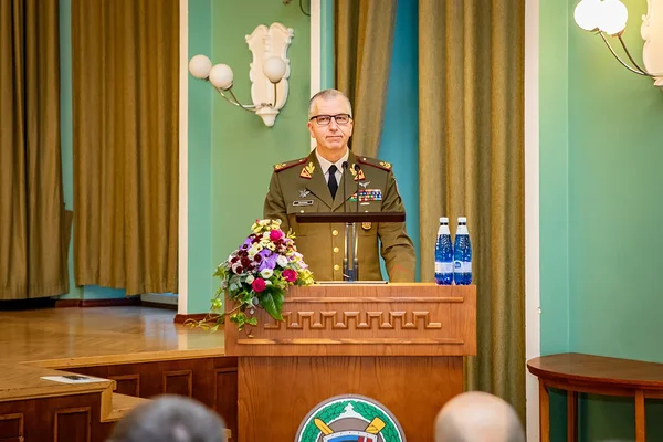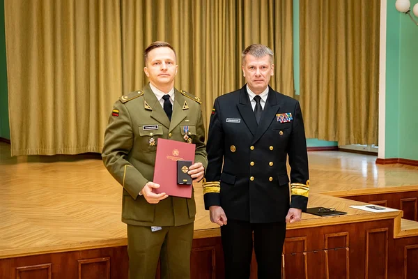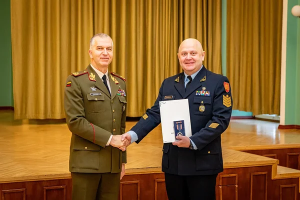 The Commandant was followed by the distinguished guest, RADM Premeneckas, who delivered his keynote address on the evolving landscape of European defence and security, emphasising the need for adaptive and well-educated leaders. He also expressed his conviction that BALTDEFCOL can provide education to support this mission.During the ceremony, RADM Premeneckas also presented Maj Darius Černiauskas, the Military Assistant and Head of Commandant’s Office, with the Lithuanian Army Medal "For Distinction" in recognition of his dedication and high-level representation at the BALTDEFCOL. Additionally, Commandant BG Šiuparis used the occasion to award CSM Alvydas Tamosiunas, the College Sergeant Major and Course Director of Command Senior Enlisted Leaders' Course, with the Medal of Merit Silver, issued in December 2025. CSM Alvydas Tamosiunas was honoured for demonstrating outstanding leadership and commitment to professional military education.